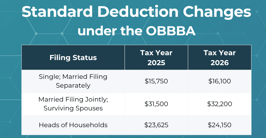 For tax year 2026, the standard deduction increases to $32,200 for married couples filing jointly. For single taxpayers and married individuals filing separately, the standard deduction rises to $16,100 for tax year 2026, and for heads of households, the standard deduction will be $24,150.